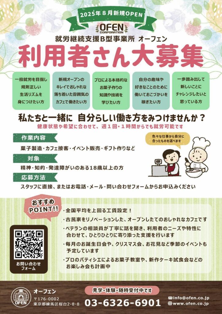 オーフェンでは障がい者の就労支援としてカフェ運営やお菓子作りをしており、現在一緒に働く利用者さんを募集しています🎶