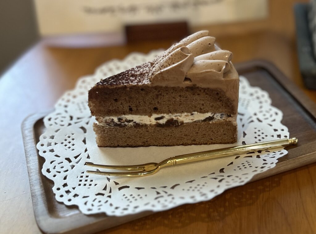 スポンジにラム酒とブランデーを含ませて、ちょっぴりビターなチョコレートでコーティング。アクセントはコーヒークリームです。ラムレーズンを忍ばせた大人のお菓子。